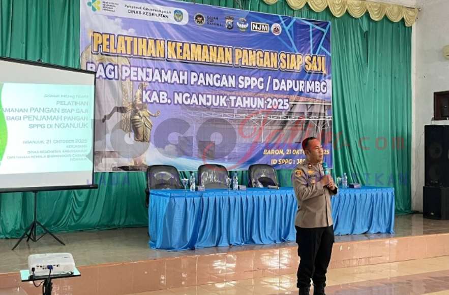 Nganjuk, Jogojatim.com – Wakapolres Nganjuk KOMPOL Andria Diana Putra, S.E., M.H. mewakili Kapolres Nganjuk AKBP Henri Noveri Santoso, S.H., S.I.K., M.M., menghadiri kegiatan Pelatihan Keamanan Pangan Siap Saji bagi Penjamah Pangan SPPG/Dapur MBG Kabupaten Nganjuk Tahun 2025 untuk wilayah Baron dan Lengkong yang digelar di Hotel Istana Nganjuk, Selasa (21/10/2025).
