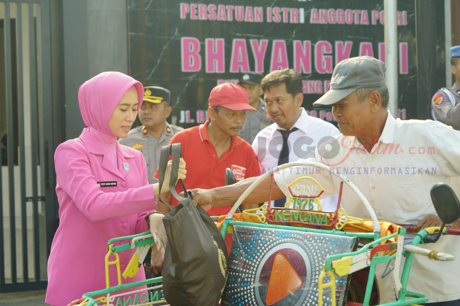 Sebanyak 250 paket bantuan sosial disalurkan kepada tukang becak yang hadir di depan pintu Gerbang Mapolres Ponorogo.