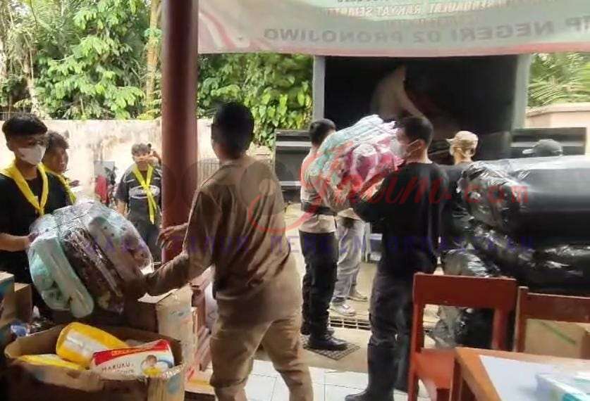 Proses penerimaan dan pendistribusian bantuan melibatkan personel Polres Lumajang, Polda Jatim, relawan, serta unsur pemerintah daerah.