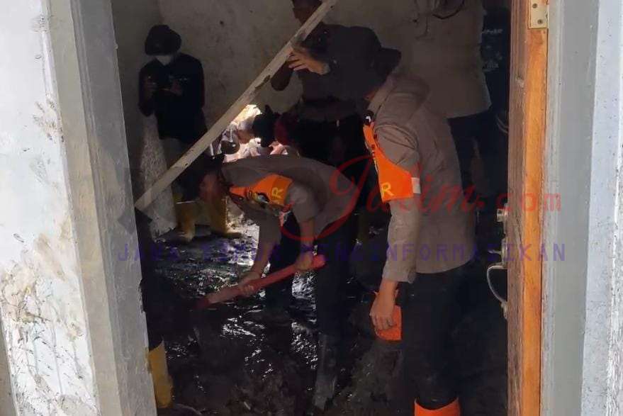 Personel gabungan Polda Jatim bekerja bersama masyarakat secara bergotong-royong, menyingkirkan lumpur, membersihkan perabotan, serta membantu memindahkan barang-barang berharga milik warga.