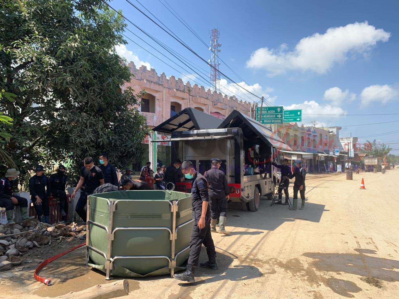 Nagan Raya, Aceh, Jogojatim. com — Personel Kompi 3 Batalyon C Pelopor, Polda Aceh, menyalurkan air bersih dan membagikan masker kepada masyarakat terdampak banjir di Kecamatan Tripa Makmur, Kabupaten Nagan Raya, Sabtu (6/12/2025) pukul 16.00 WIB. Kegiatan kemanusiaan ini dipimpin langsung oleh Wadanki 3 Batalyon C Pelopor, Ipda Ulil Azmi Azwni, S.E.