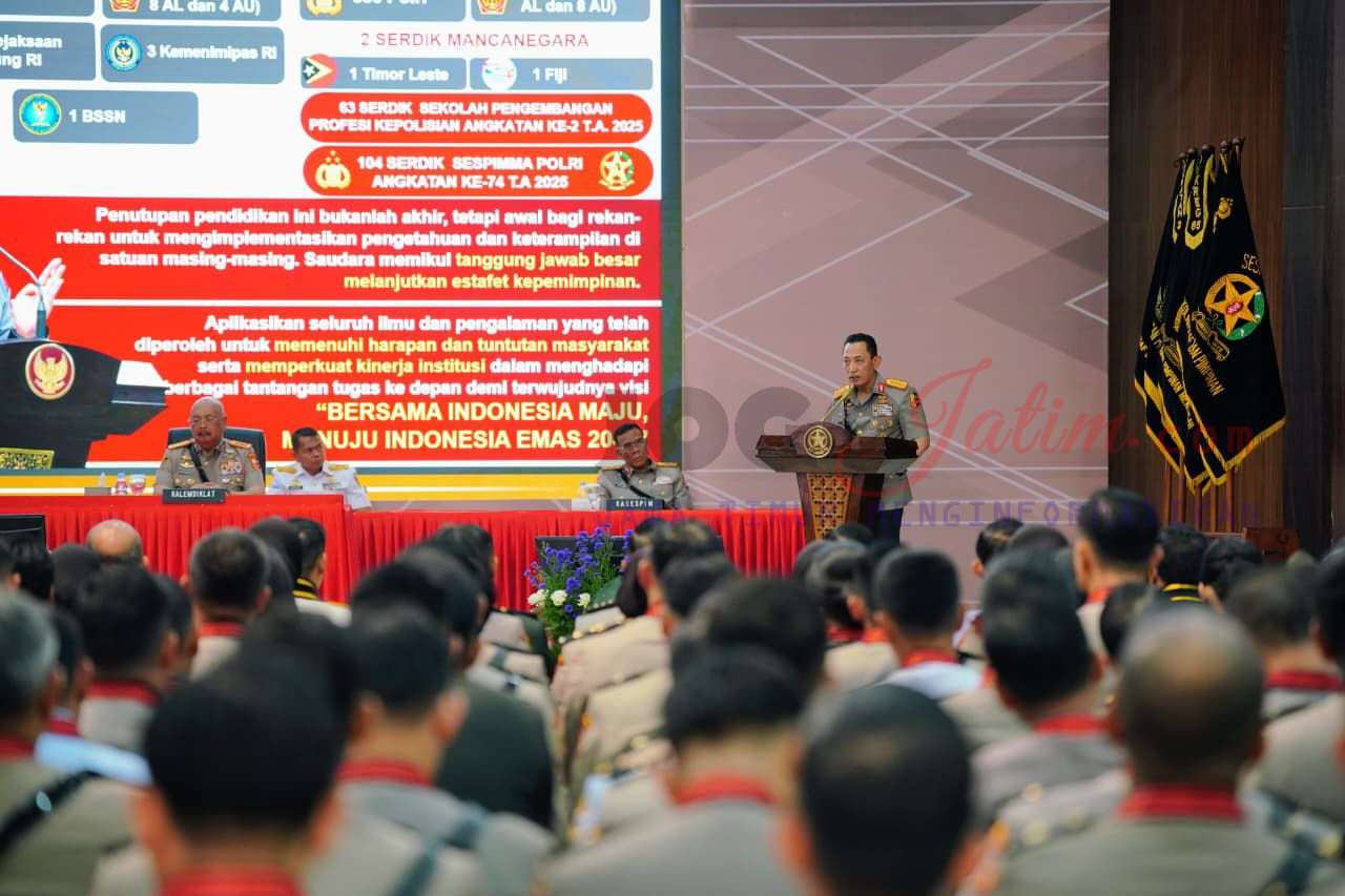 Lembang, Jogojatim. com — Kapolri Jenderal Polisi Drs. Listyo Sigit Prabowo, M.Si. menghadiri sekaligus memimpin upacara penutupan Pendidikan Sekolah Staf dan Pimpinan Tinggi (Sespimti) Polri Dikreg ke-34, Sespimmen Polri Dikreg ke-65, Sekolah Pembentukan Perwira Kepolisian (SPPK) Angkatan ke-2, serta Sespimma Polri Angkatan ke-74 Tahun Ajaran 2025. Kegiatan tersebut berlangsung pada Rabu, 17 Desember 2025, pukul 09.00 WIB, bertempat di Gedung Utaryo Suryawinata Sespim Lemdiklat Polri, Lembang, Jawa Barat.