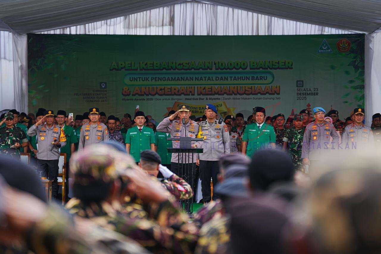 Cirebon, Jogojatim. com – Kepala Kepolisian Negara Republik Indonesia (Kapolri) Jenderal Polisi Listyo Sigit Prabowo memimpin langsung Apel Kebangsaan Banser untuk Pengamanan Hari Raya Natal 2025 dan Tahun Baru 2026 yang dirangkaikan dengan Penganugerahan Kemanusiaan Riyanto Award 2025, Selasa (23/12/2025). Kegiatan tersebut dilaksanakan di Halaman Masjid Syarif Abdurachman, Cirebon, Jawa Barat.