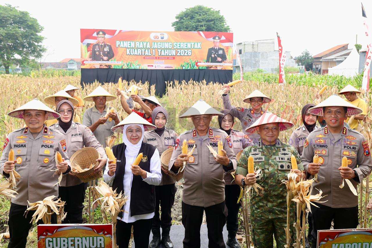 SIDOARJO, Jogojatim. com – Kepolisian Daerah Jawa Timur menggelar Panen Raya Jagung Serentak Kuartal IV Tahun 2025–2026 sebagai wujud dukungan terhadap program Swasembada Pangan Nasional.