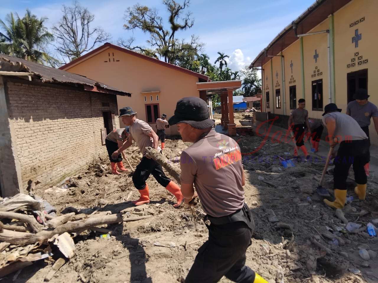 Dipimpin oleh Danton Penugasan Iptu Deny Lius Tarigan, S.H., personel Brimob bekerja secara bertahap dengan mengerahkan peralatan manual dan mesin, mulai dari cangkul, sekop, beko sorong, mesin penyedot air, hingga chainsaw, guna mempercepat proses pembersihan dan perbaikan.