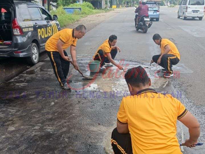 Dalam kegiatan tersebut, personel Polsek Krian dan Polsek Balongbendo bersama warga sekitar bergotong royong menutup lubang jalan menggunakan material penimbun.