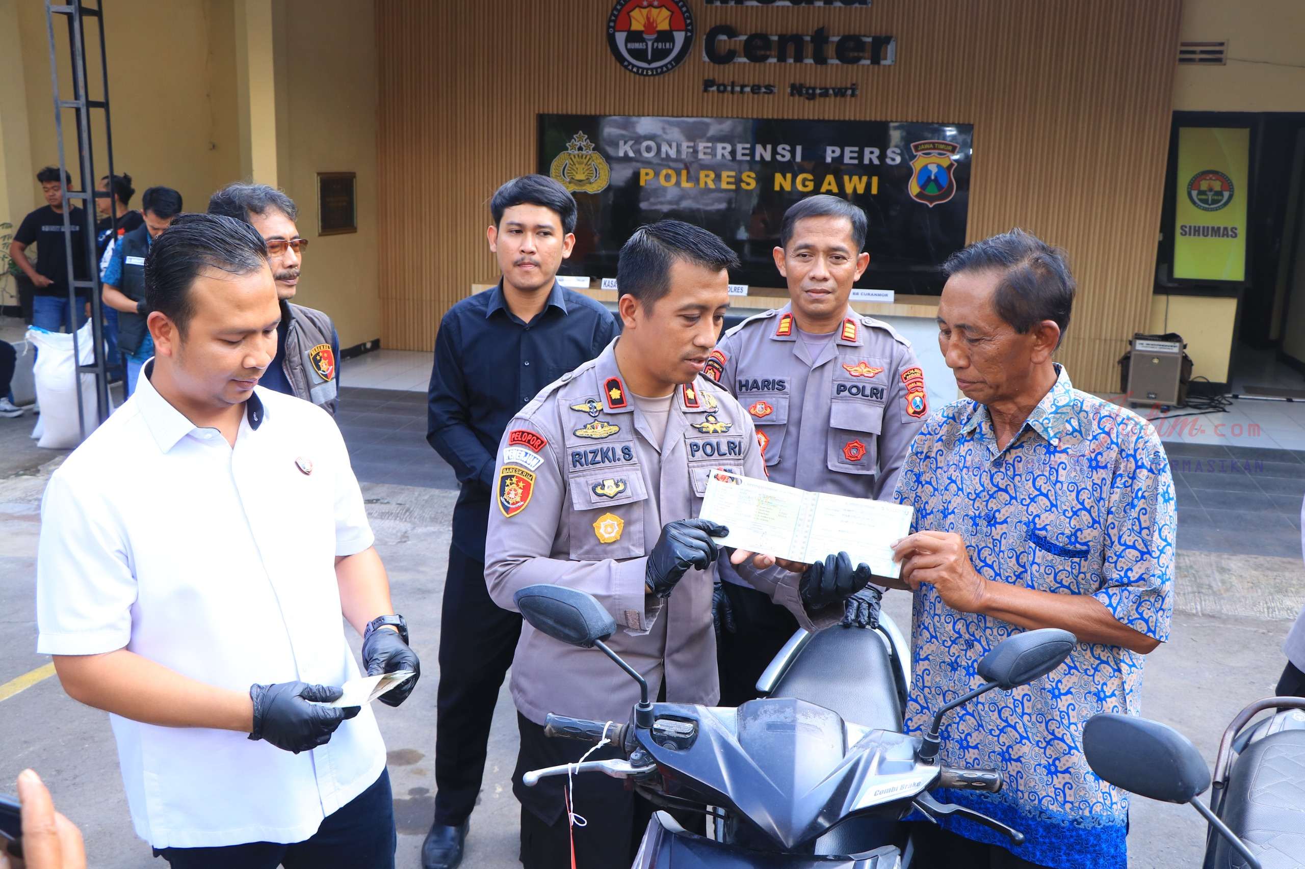 Setelah berhasil mengamankan tersangka dan menemukan kendaraan yang dilaporkan hilang, Wakapolres Ngawi Kompol Rizki Santoso, S.I.K yang didampingi Kasatreskrim Polres Ngawi AKP Aris Gunadi, S.H secara resmi menyerahkan barang bukti kepada para pemiliknya.